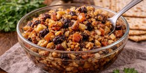 A sweet Passover mixture made with chopped apples, walnuts, honey, cinnamon, and sweet red wine, traditionally served during the Seder.