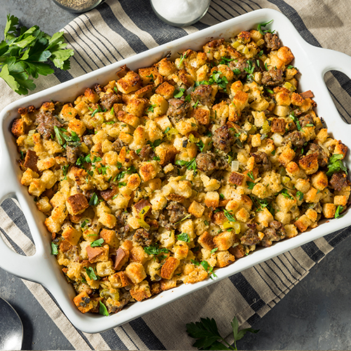 A holiday hearty favorite complete with roasted cubed bread, tart green apples, sweet dried apricots, and savory pork sausage.