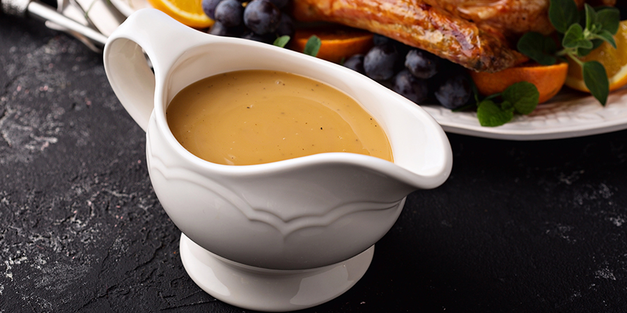- Strain pan drippings, discard solids and reserve approximately 2 ½ cups of pan drippings and set aside.